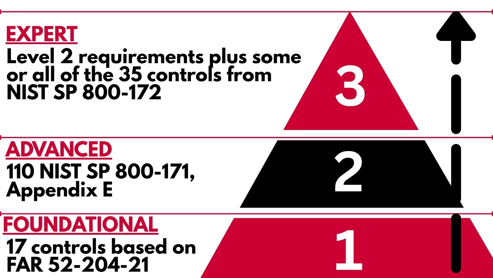 CMMC has three certification levels, each building on the last to match the sensitivity of the work a company does with the government:
